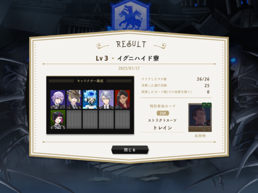 少々の不運はありつつも、相手の攻撃がそこまでダメージが高くないことと、できるだけバフのマスを明けてからターゲットに行ったり、ギリギリまで回復を踏まずに行ったりして進めました。